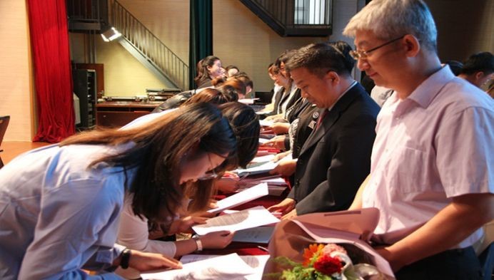 现场举行了指导教师聘书颁发和师徒结对签约仪式,指导教师和青年教师仔细阅读了“师徒结对协议书”并郑重地在上面签下了自己的名字,青年教师向指导教师行拜师礼并献花。指导教师代表刘智慧老师承诺一定会尽职尽责、不负众望,为学校的发展贡献自己的力量,并对新教师提出了殷切的期望,希望他们踏实工作、提升素质、把握机会、展现自我。青年教师代表蔡璐表态,将虚心地接受指导教师的辅导和督促,继承师父们爱岗敬业、勤奋钻研、孜孜不倦、无私奉献的精神,不辜负师父们的栽培和希望。